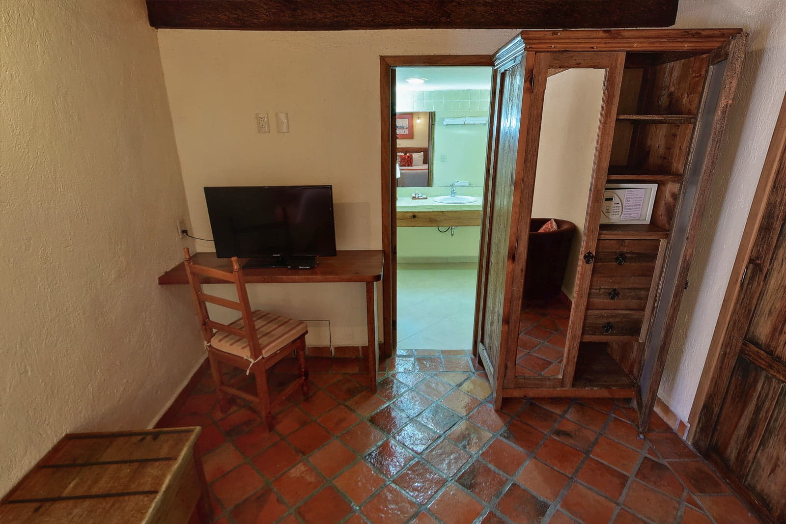 Enjoy a unique experience in this colonial-style suite, designed for those seeking comfort, privacy, and a romantic ambiance in San Cristóbal de las Casas. The spacious king-size bed, wood details, warm lighting, and traditional décor create a welcoming and elegant space.