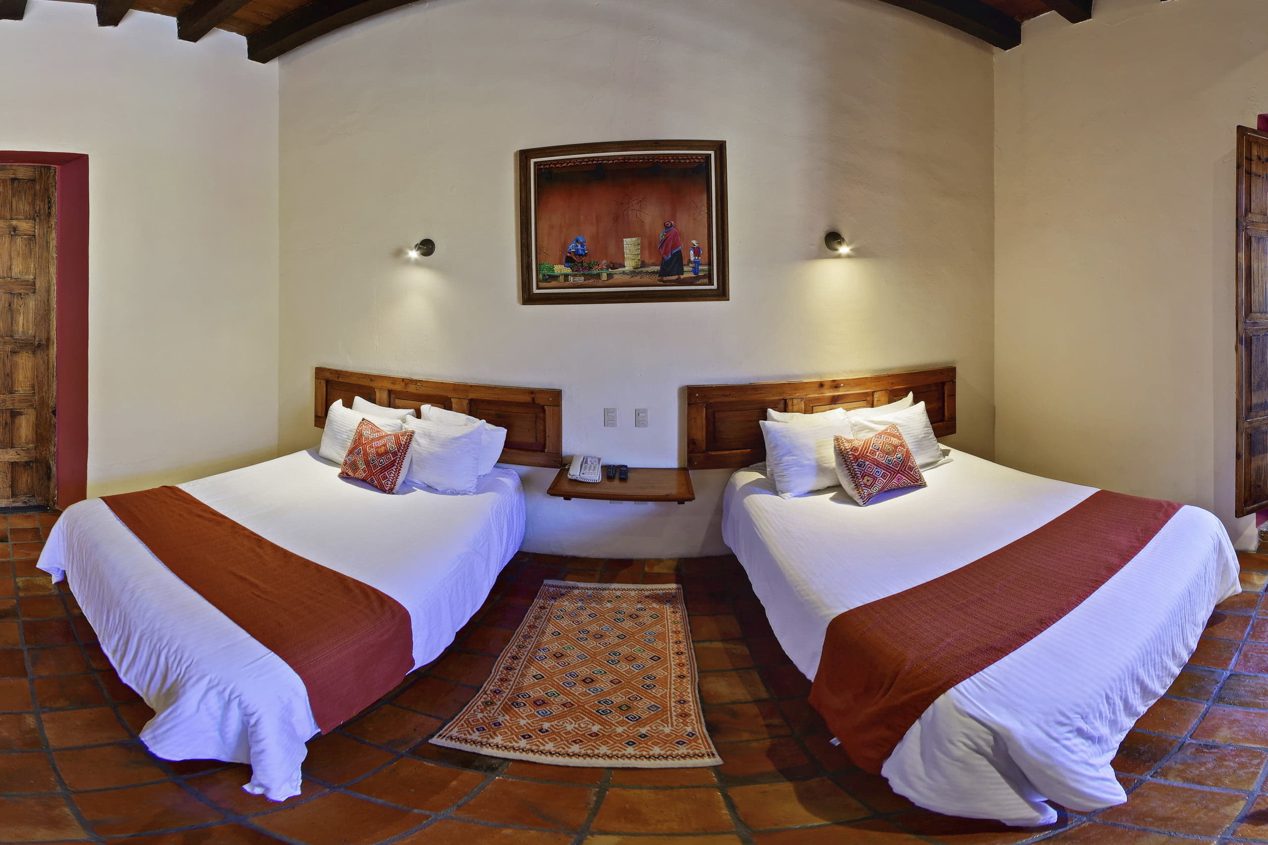 It features three double beds distributed in a spacious area, with wooden details, exposed beams and clay floors that reflect the hotel's colonial architecture.