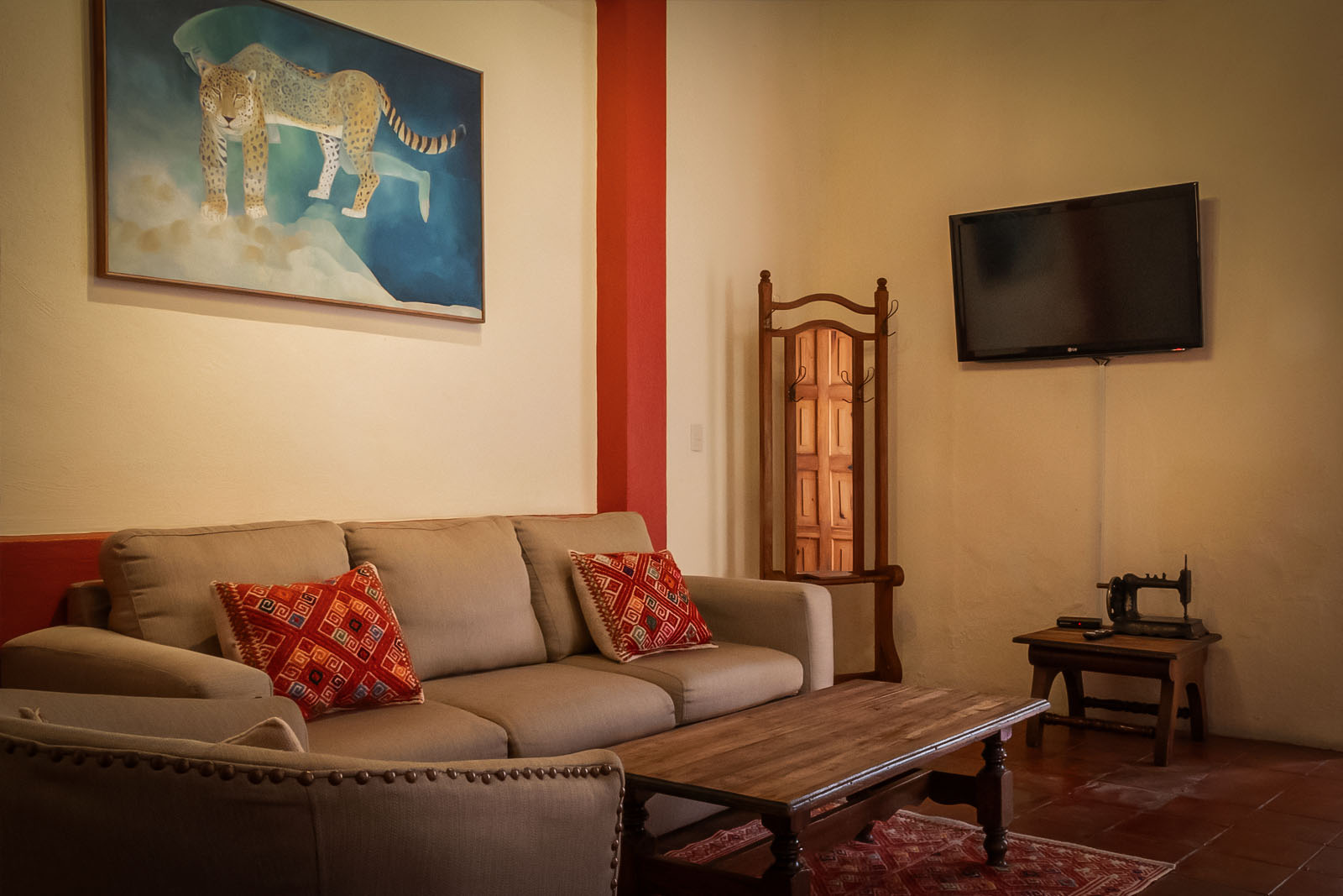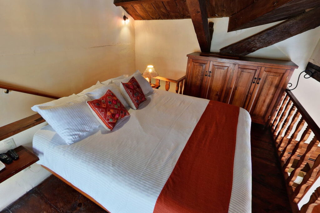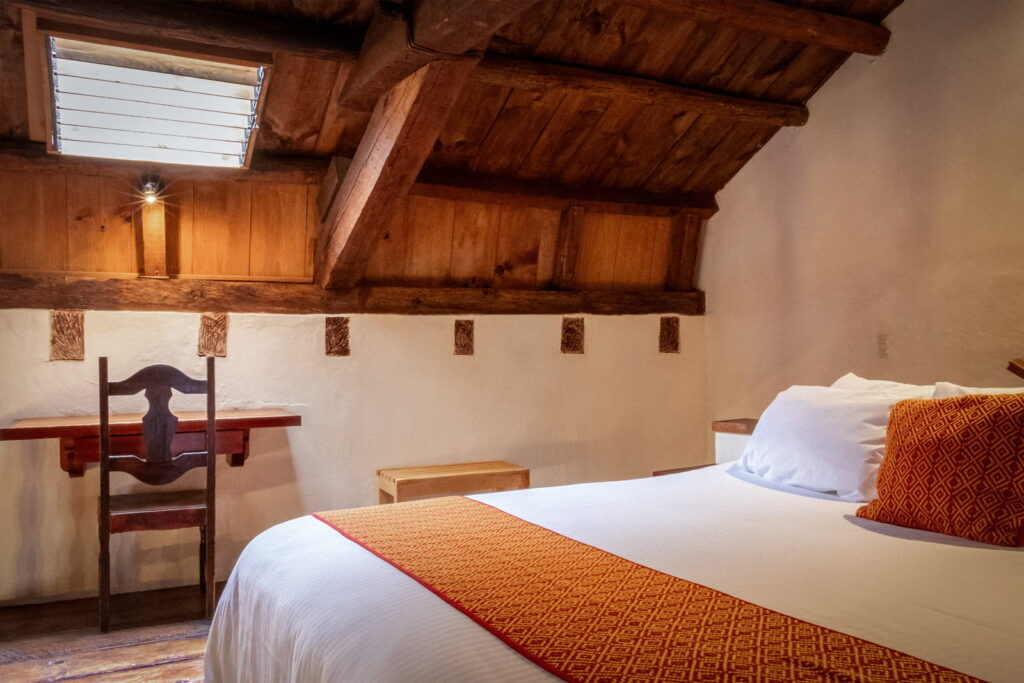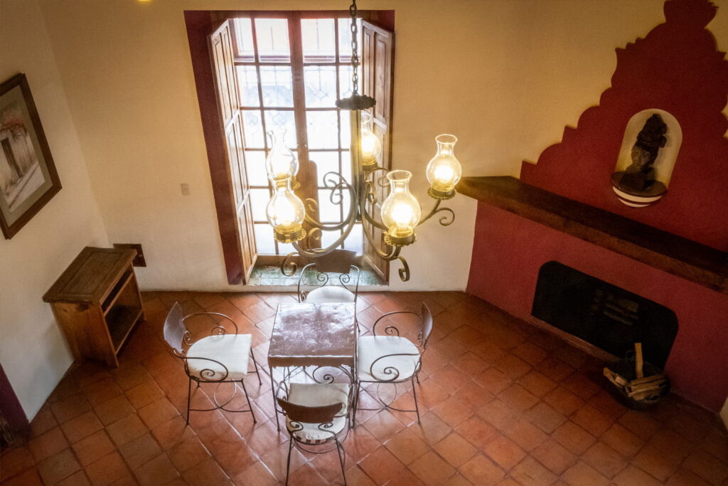 The suite features a master bedroom, sitting areas, living room, and dining room, creating separate spaces for comfortable relaxation and socializing. Its wooden beams, terracotta floors, and handcrafted details reflect the colonial architecture of San Cristóbal de las Casas.